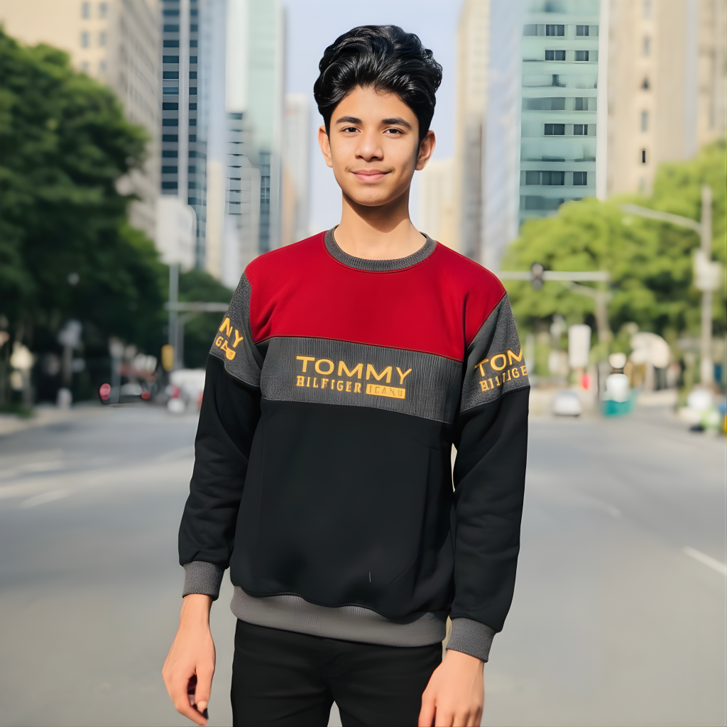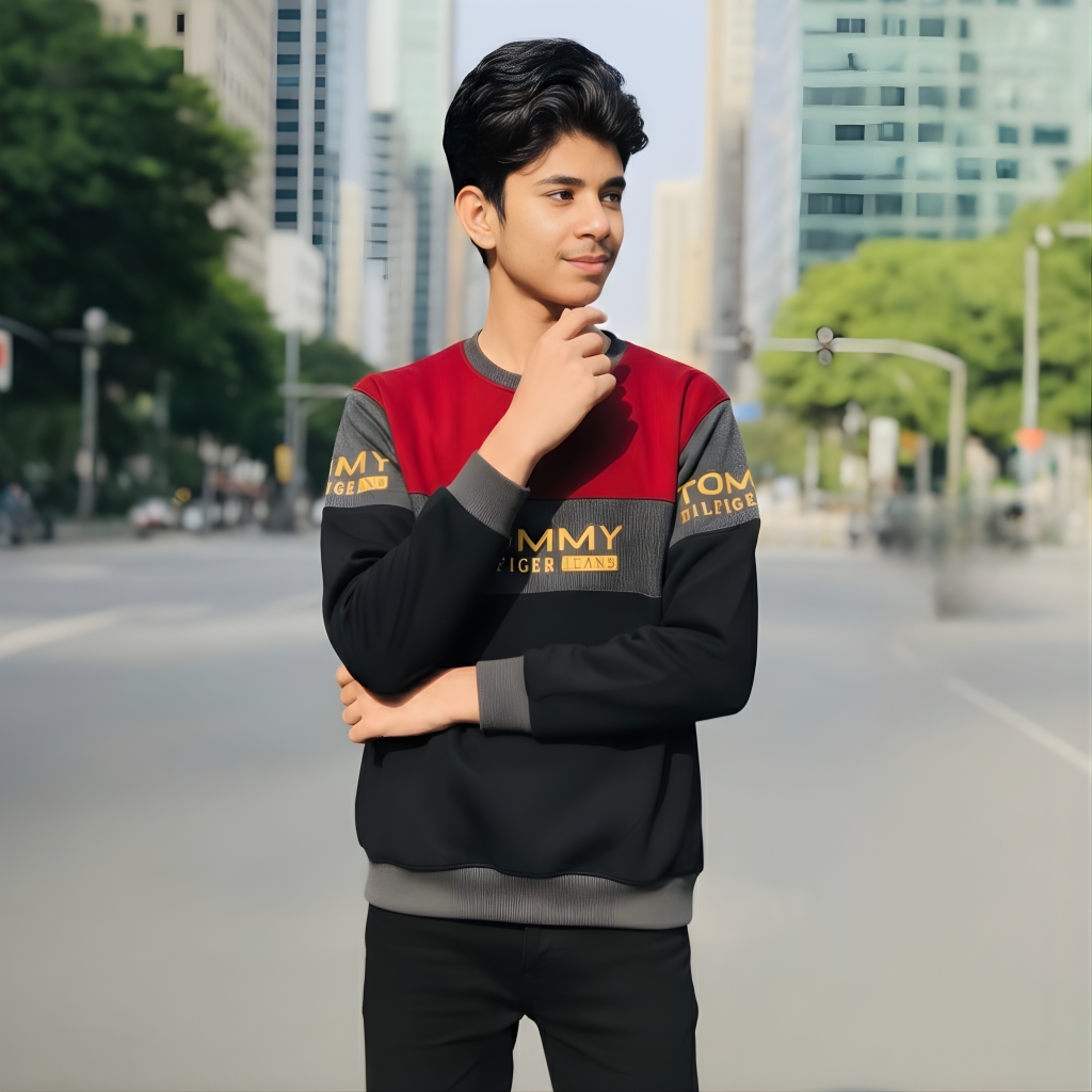 Cotton Wool Blend Men’s Sweatshirt with Red Color Block Design – Winter Crewneck
